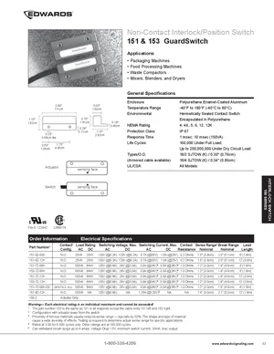Datasheet for the Edwards EST 151 & 153 GuardSwitch. 12 models including 151, 153, 151-6Z-06K and 9 additional variants. Detailed technical specifications, electrical ratings, and agency listings.