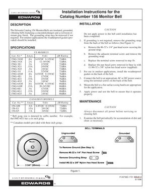 Installation Manual for the Edwards EST 156 Monitor Bell, published in 1996. Document No: P-047550-1731, Rev: ISSUE 2. 19 models including 156, 156G-3AM, 156G-3AX and 16 additional variants. Hardware installation, terminal connections, and environmental requirements.