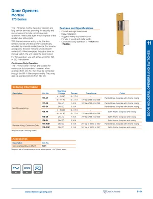 Datasheet for the Edwards EST 170 Series Mortise Door Openers. 8 models including 177-AF, 177-G5, 177-G1 and 5 additional variants. Product features, environmental operating limits, and compatibility data.