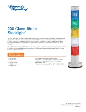 Datasheet for the Edwards EST 200 Class 18mm Stacklight, published in 2011. Document No: ES001-0119, Rev: 1. 7 models including 218BC, 218LEDSB24AD, 218LEDSA24AD and 4 additional variants. Product features, environmental operating limits, and compatibility data.