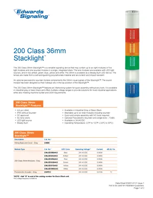 Datasheet for the Edwards EST 200 Class 36mm Stacklight, published in 2011. Document No: ES001-0121, Rev: 1. 8 models including 236BC, 236LEDSB24AD, 236LEDSA24AD and 5 additional variants. Product features, environmental operating limits, and compatibility data.