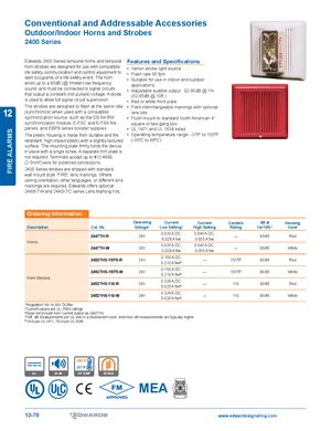 Datasheet for the Edwards EST 2400 Series Horns and Strobes. Document No: 12-70. 18 models including 2400 Series, 2447TH-R, 2447TH-W and 15 additional variants. Product features, environmental operating limits, and compatibility data.