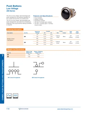 Datasheet for the Edwards EST 250 Series Push Buttons. Models 250 and 255. Detailed technical specifications, electrical ratings, and agency listings.