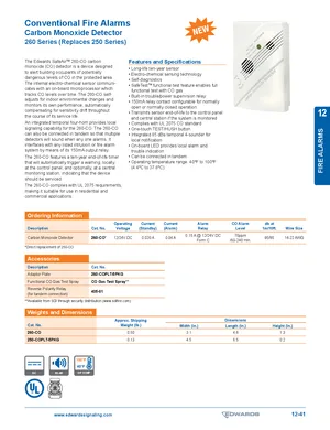Datasheet for the Edwards EST 260 Series Carbon Monoxide Detector. Model 260-CO. Product features, environmental operating limits, and compatibility data.