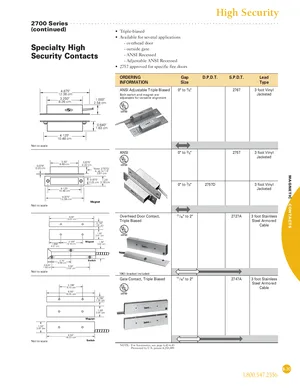 Datasheet for the Edwards EST 2700 Series High Security Contacts. 6 models including 2700 Series, 2767, 2757 and 3 additional variants. Product features, environmental operating limits, and compatibility data.