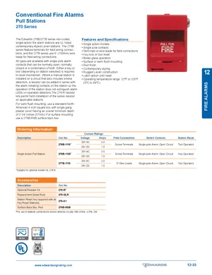 Datasheet for the Edwards EST 270 Series Pull Stations. 10 models including 270 Series, 276B-1110, 276B-1120 and 7 additional variants. Detailed technical specifications, electrical ratings, and agency listings.