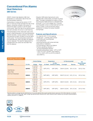 Datasheet for the Edwards EST 280 Series Heat Detectors. 6 models including 281B-PL, 282B-PL, 283B-PL and 3 additional variants. Product features, environmental operating limits, and compatibility data.