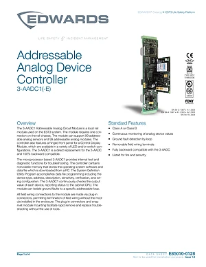Datasheet for the Edwards EST 3-AADC1 Analog Device Controller, published in 2020. Document No: E85010-0128, Rev: 1.2. Models 3-AADC1 and 3-AADC1-E. Detailed technical specifications, electrical ratings, and agency listings.