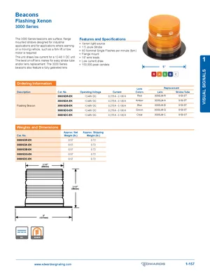 Datasheet for the Edwards EST 3000 Series Flashing Xenon Beacons. 5 models including 3000SDR-EK, 3000SDA-EK, 3000SDB-EK and 2 additional variants. Detailed technical specifications, electrical ratings, and agency listings.