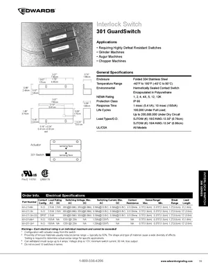 Datasheet for the Edwards EST 301 GuardSwitch. 5 models including 301-CT-06K, 301-CT-12K, 301-CT-12K-CD and 2 additional variants. Detailed technical specifications, electrical ratings, and agency listings.