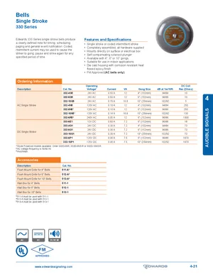 Datasheet for the Edwards EST 330 Series Single Stroke Bells. 13 models including 332-4G5, 332-6G5, 332-10G5 and 10 additional variants. Engineering specifications, wiring diagrams, and mounting dimensions.