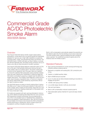 Datasheet for the Edwards EST 350/320A Series Smoke Alarms, published in 2013. Document No: FX85001-0593, Rev: Issue 3. 6 models including 320A, 350, 320ACC and 3 additional variants. Product features, environmental operating limits, and compatibility data.