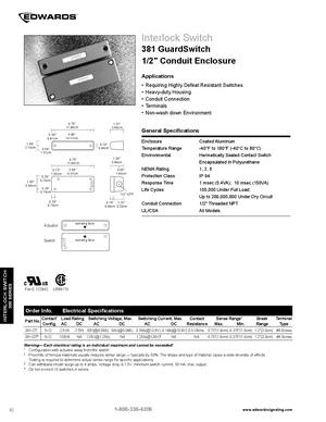 Datasheet for the Edwards EST 381 GuardSwitch. Models 381-CT and 381-DT. Detailed technical specifications, electrical ratings, and agency listings.