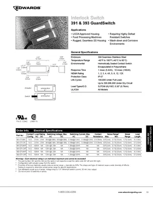 Datasheet for the Edwards EST 391 & 393 GuardSwitch. 8 models including 391, 393, 391-CT-06K and 5 additional variants. Engineering specifications, wiring diagrams, and mounting dimensions.