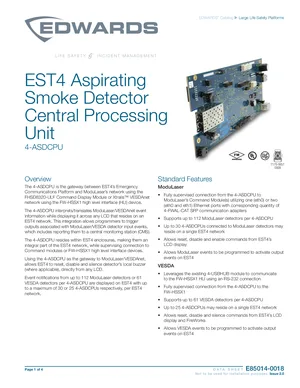 Datasheet for the Edwards EST 4-ASDCPU, published in 2024. Document No: E85014-0018, Rev: Issue 2.0. 25 models including 4-ASDCPU, FHSD8320-ULF, FW-HSSX1 and 22 additional variants. Detailed technical specifications, electrical ratings, and agency listings.