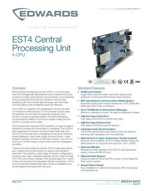 Datasheet for the Edwards EST 4-CPU, published in 2023. Document No: E85014-0010, Rev: Issue 3.0. 20 models including 4-CPU, 4-CPU-E, 4-AUDTELS-E and 17 additional variants. Detailed technical specifications, electrical ratings, and agency listings.
