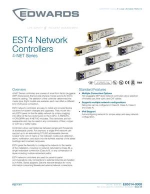 Datasheet for the Edwards EST 4-NET Series Network Controllers, published in 2023. Document No: E85014-0008, Rev: 3.0. 8 models including 4-NET-TP, 4-NET-TP-HC, 4-NET-MM and 5 additional variants. Detailed technical specifications, electrical ratings, and agency listings.