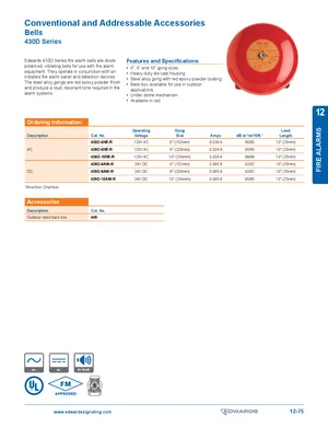 Datasheet for the Edwards EST 430D Series Bells. 6 models including 438D-6N5-R, 438D-8N5-R, 438D-10N5-R and 3 additional variants. Detailed technical specifications, electrical ratings, and agency listings.
