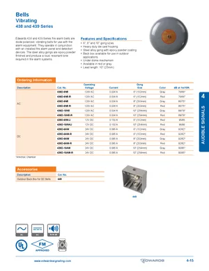 Datasheet for the Edwards EST 438 and 439 Series Vibrating Bells. 15 models including 438D-6N5, 438D-6N5-R, 438D-8N5 and 12 additional variants. Engineering specifications, wiring diagrams, and mounting dimensions.