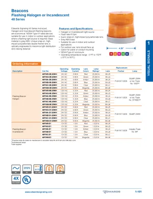 Datasheet for the Edwards EST 48 Series Flashing Beacons. 24 models including 48FINR-G5-20WH, 48FING-G5-20WH, 48FINA-G5-20WH and 21 additional variants. Detailed technical specifications, electrical ratings, and agency listings.