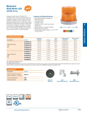 Datasheet for the Edwards EST 48XBR Series Multi-Mode LED Beacons. 10 models including 48XBRMA120A, 48XBRMB120A, 48XBRMG120A and 7 additional variants. Engineering specifications, wiring diagrams, and mounting dimensions.