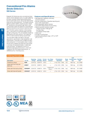 Datasheet for the Edwards EST 500 Series Smoke Detectors. 4 models including 521B, 521BXT, 521NCRXT and 1 additional variants. Product features, environmental operating limits, and compatibility data.