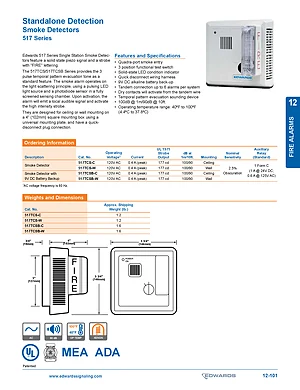 Datasheet for the Edwards EST 517TCS Series Smoke Detectors. Document No: 12-101. 4 models including 517TCS-C, 517TCS-W, 517TCSB-C and 1 additional variants. Detailed technical specifications, electrical ratings, and agency listings.