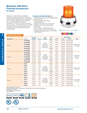 Datasheet for the Edwards EST 51 Series Flashing Beacons. 24 models including 51A-G5-20W, 51B-G5-20W, 51C-G5-20W and 21 additional variants. Detailed technical specifications, electrical ratings, and agency listings.