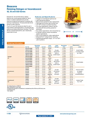 Datasheet for the Edwards EST 52, 53 and 53D Series Beacons, published in 2014. 33 models including 52A-G5-20WH, 52B-G5-20WH, 52C-G5-20WH and 30 additional variants. Product features, environmental operating limits, and compatibility data.