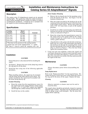 Installation Manual for the Edwards EST 53 Series AdaptaBeacon Signals, published in 1997. Document No: P-047550-0738, Rev: 4. 4 models including 53 -E1, 53 -G1, 53 -FY and 1 additional variants. Hardware installation, terminal connections, and environmental requirements.
