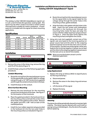 Installation Manual for the Edwards EST 53D-GW Series AdaptaBeacon, published in 2004. Document No: 3100633, Rev: 2. 6 models including 53DA-GW, 53DB-GW, 53DC-GW and 3 additional variants. Physical installation guide, backbox dimensions, and cabling specifications.
