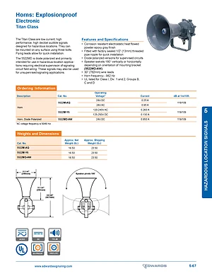 Datasheet for the Edwards EST 5522M Series Explosionproof Horns. Models 5522M-AQ, 5522M-Y6 and 5522MD-AW. Engineering specifications, wiring diagrams, and mounting dimensions.