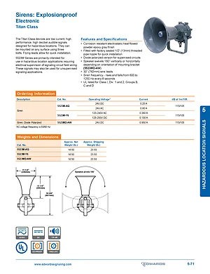 Datasheet for the Edwards EST 5523M Series Explosionproof Sirens. Models 5523M-AQ, 5523M-Y6 and 5523MD-AW. Engineering specifications, wiring diagrams, and mounting dimensions.