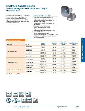 Datasheet for the Edwards EST 5531M Series Audible Signals. 11 models including 5531M-24AQ, 5531M-24N5, 5531M-120N5 and 8 additional variants. Product features, environmental operating limits, and compatibility data.