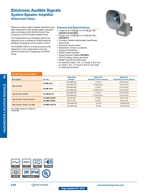 Datasheet for the Edwards EST 5532 Series System Speaker Amplifiers, published in 2014. 6 models including 5532M-25Y6, 5532M-70Y6, 5532M-485Y6 and 3 additional variants. Detailed technical specifications, electrical ratings, and agency listings.