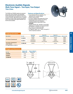 Datasheet for the Edwards EST 5533M Series Audible Signals. Document No: 4-91. Models 5533M-AQ, 5533M-Y6 and 5533MD-AW. Product features, environmental operating limits, and compatibility data.