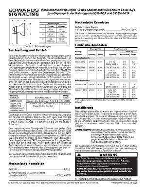 Installation Manual for the Edwards EST 5536M/5536MHV (German), published in 2003. Document No: 3100009, Rev: 2. 5 models including 5536M-24AQ, 5536M-24N5, 5536M-24Y6 and 2 additional variants. Physical installation guide, backbox dimensions, and cabling specifications.