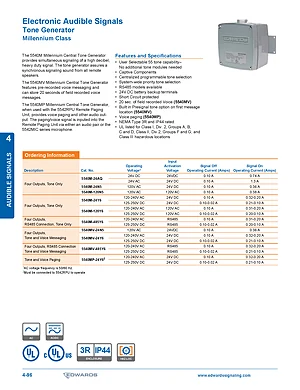 Datasheet for the Edwards EST 5540M Series Tone Generators. 10 models including 5540M-24AQ, 5540M-24N5, 5540M-120N5 and 7 additional variants. Product features, environmental operating limits, and compatibility data.