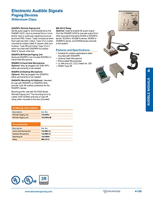Datasheet for the Edwards EST 5542 Series Paging Devices. Document No: 4-105. Models 5542RPU and 5542RPU-M. Detailed technical specifications, electrical ratings, and agency listings.