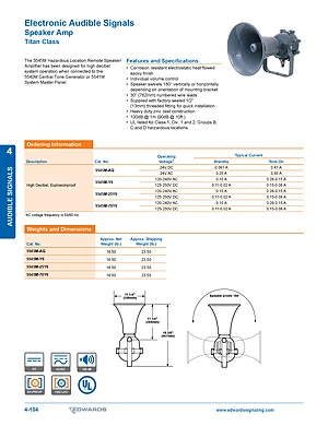 Datasheet for the Edwards EST 5545M Series Speaker Amplifiers. 4 models including 5545M-AQ, 5545M-Y6, 5545M-25Y6 and 1 additional variants. Detailed technical specifications, electrical ratings, and agency listings.