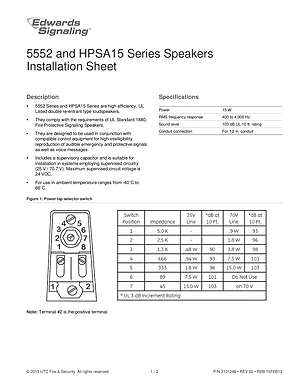 Installation Manual for the Edwards EST 5552/HPSA15 Series Speakers, published in 2013. Document No: 3101246, Rev: 02. Models 5552 and HPSA15. Mounting instructions, wiring diagrams, and system power-up procedures.