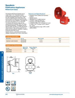 Datasheet for the Edwards EST 5553 Series Hazardous Speakers. Models 5553-25/70-G and 5553-25/70-R. Engineering specifications, wiring diagrams, and mounting dimensions.