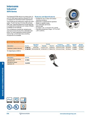 Datasheet for the Edwards EST 5570 Series Industrial Intercoms. Models 5570M-AQ and 5570M-NR5. Product features, environmental operating limits, and compatibility data.