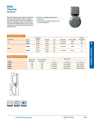 Datasheet for the Edwards EST 55 Series Vibrating Bells. 4 models including 55-4G5, 55-6G5, 55-4AM and 1 additional variants. Detailed technical specifications, electrical ratings, and agency listings.