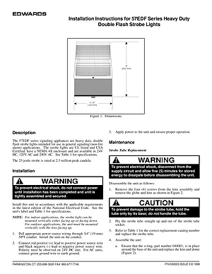 Installation Manual for the Edwards EST 57EDF Series Strobe Lights, published in 1998. Document No: 500003, Rev: 3. 15 models including 57EDFA-G1, 57EDFB-G1, 57EDFC-G1 and 12 additional variants. Physical installation guide, backbox dimensions, and cabling specifications.