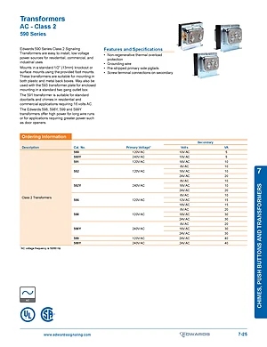 Datasheet for the Edwards EST 590 Series Transformers. 10 models including 590, 590Y, 591 and 7 additional variants. Detailed technical specifications, electrical ratings, and agency listings.