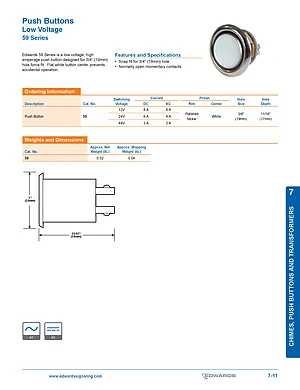 Datasheet for the Edwards EST 59 Series Push Buttons. Model 59. Engineering specifications, wiring diagrams, and mounting dimensions.