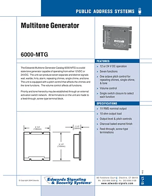 Datasheet for the Edwards EST 6000-MTG, published in 2004. Document No: D-04. Model 6000-MTG. Product features, environmental operating limits, and compatibility data.