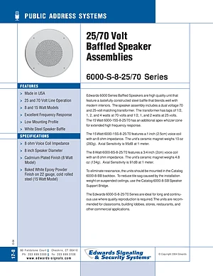 Datasheet for the Edwards EST 6000 Series Baffled Speakers, published in 2004. Document No: 17-8. Models 6000-8S-8-25/70 and 6000-15S-8-25/70. Product features, environmental operating limits, and compatibility data.