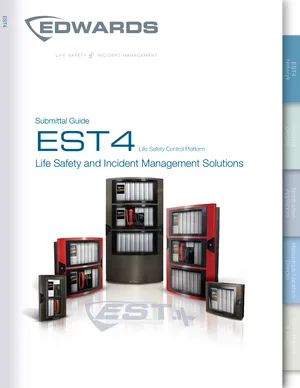 Submittal Guide for the Edwards EST4, published in 2023. Document No: E85014-0019. 86 models including EST4, 4-CPU, 4-NET-TP and 83 additional variants. Project documentation, technical specifications, and agency listings.